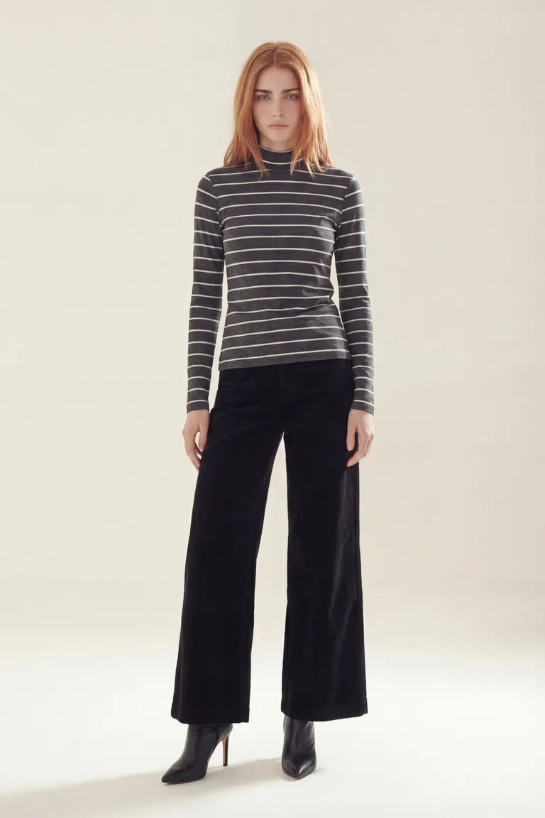 Remera de corte entallado con cuello subido y diseño de rayas horizontales. Una prenda versátil de mangas largas, ideal para combinar en looks casuales o formales durante todo el año. Su diseño clásico la convierte en un básico imprescindible para el guardarropa femenino, ofreciendo comodidad y un ajuste favorecedor.