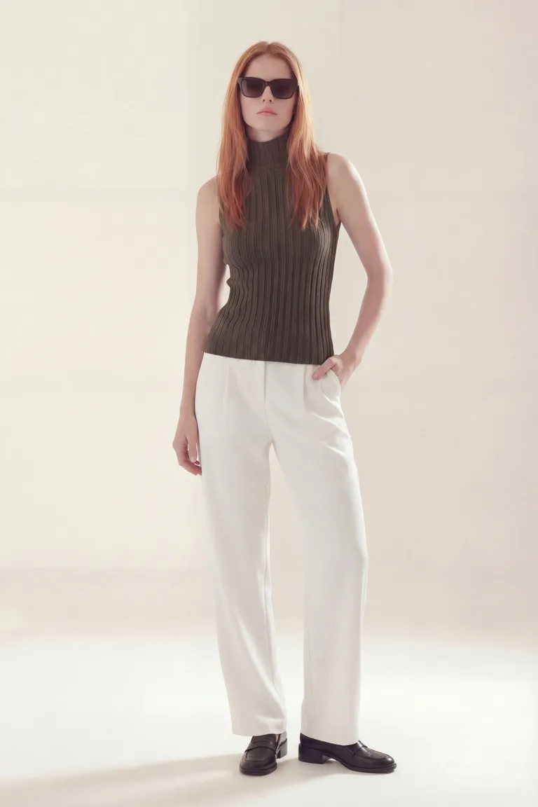 Remera sin mangas de diseño entallado con cuello alto y textura acanalada. Presenta un corte clásico que se adapta a la silueta, ideal para combinar en diversos outfits diarios por su estilo versátil y minimalista.