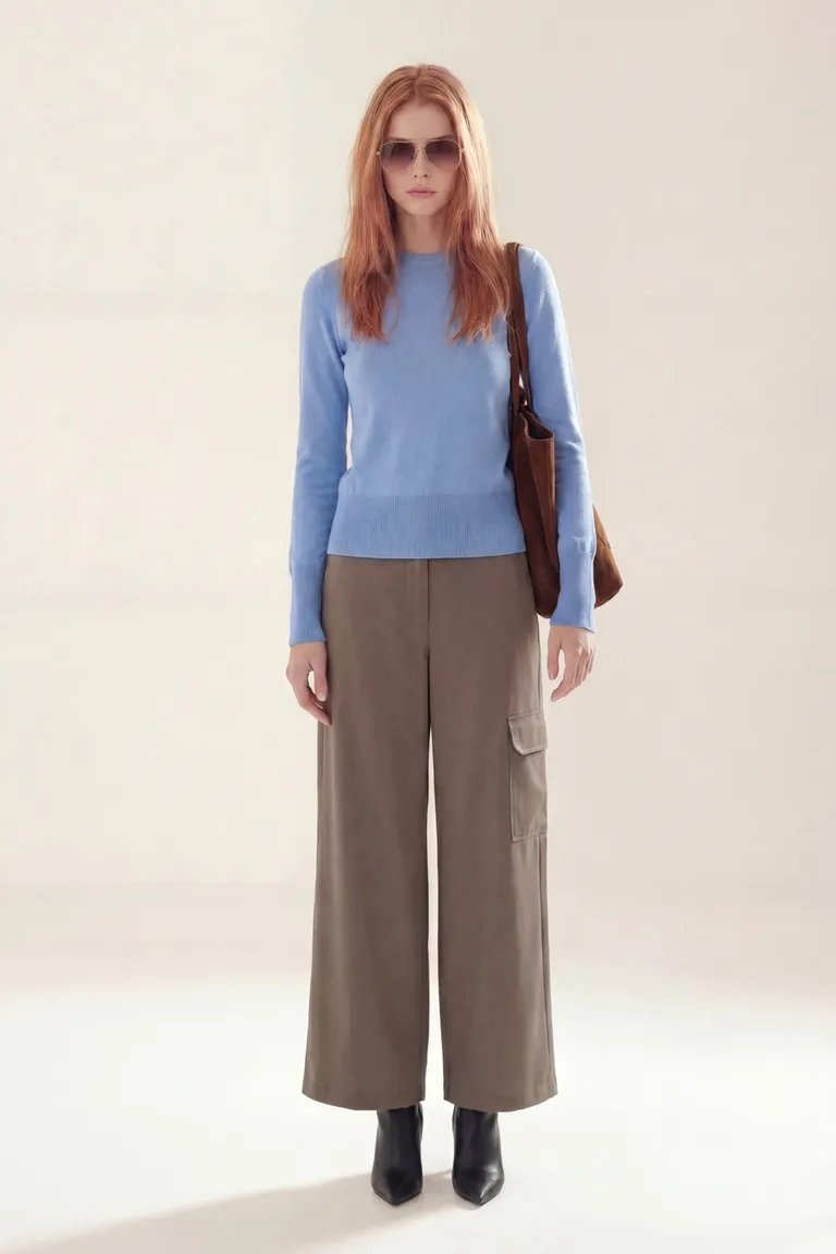 Sweater de tejido liso con cuello redondo y mangas largas. Presenta un diseño clásico de corte ajustado al cuerpo con detalles acanalados en el dobladillo y los puños, ideal para completar outfits versátiles de temporada.