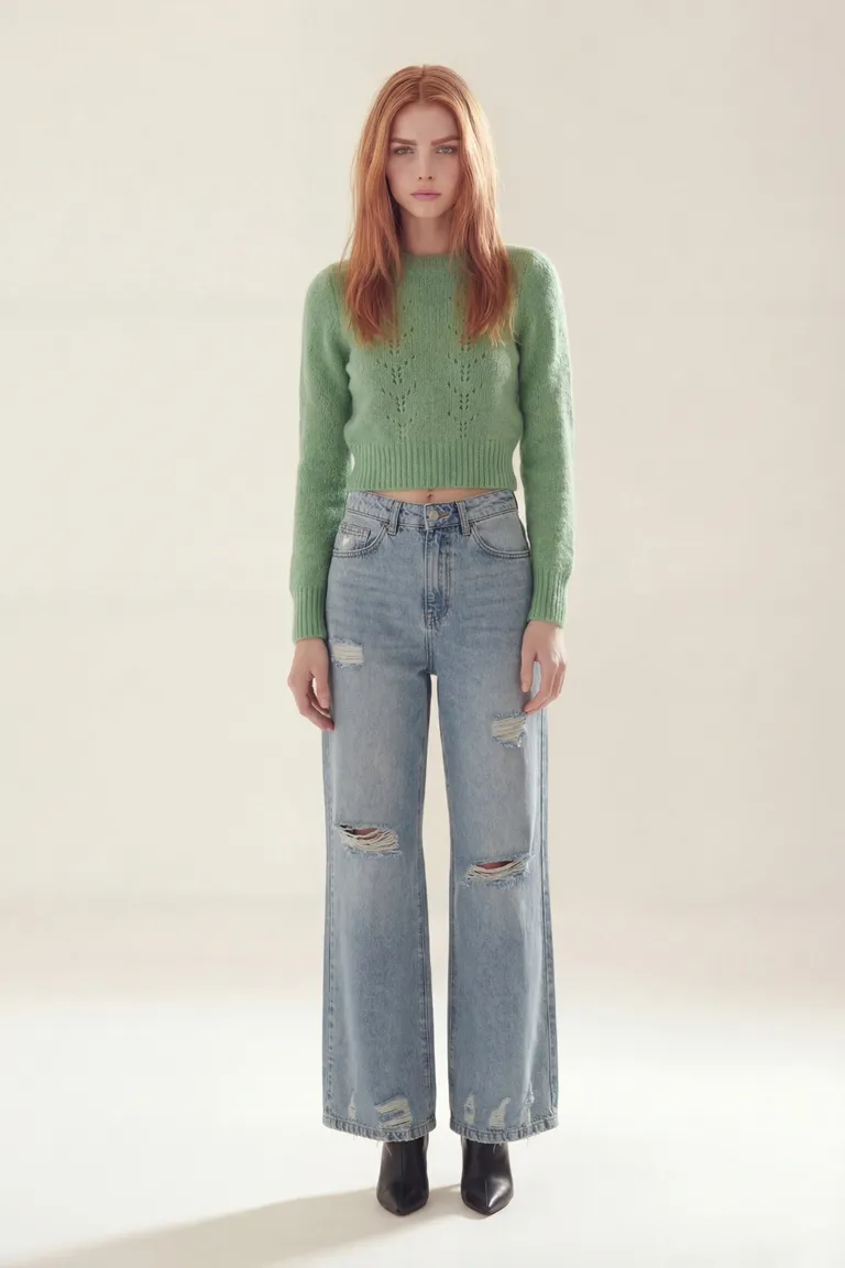 Sweater de tejido liviano con cuello redondo y detalle de calados frontales. Diseño de corte cropped, ideal para completar conjuntos casuales de media estación, aportando una textura suave y un calce cómodo al cuerpo.