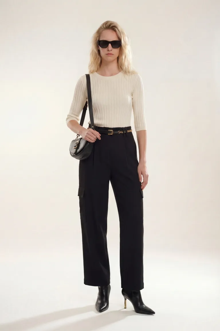 Sweater tejido con diseño de cuello redondo y mangas tres cuartos. Presenta una textura acanalada sutil, ideal para combinar en looks diarios o formales. Su corte entallado se ajusta al cuerpo brindando comodidad.