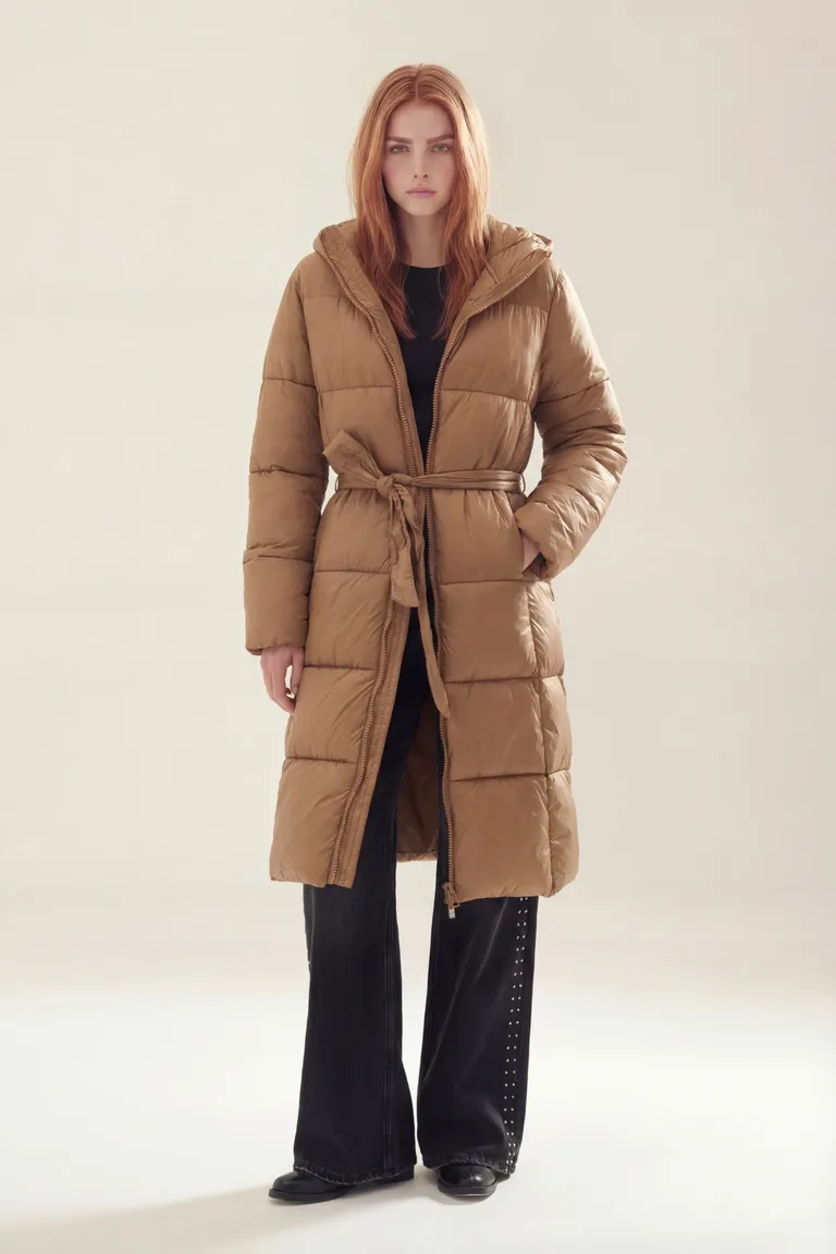 Campera larga tipo puffer con capucha y ajuste en la cintura mediante lazo. Presenta un diseño acolchado con cierre frontal, ideal para los días de bajas temperaturas. Esta prenda cuenta con bolsillos laterales y una silueta que se adapta cómodamente al cuerpo. Una pieza esencial de abrigo para complementar los outfits de invierno con estilo y funcionalidad.