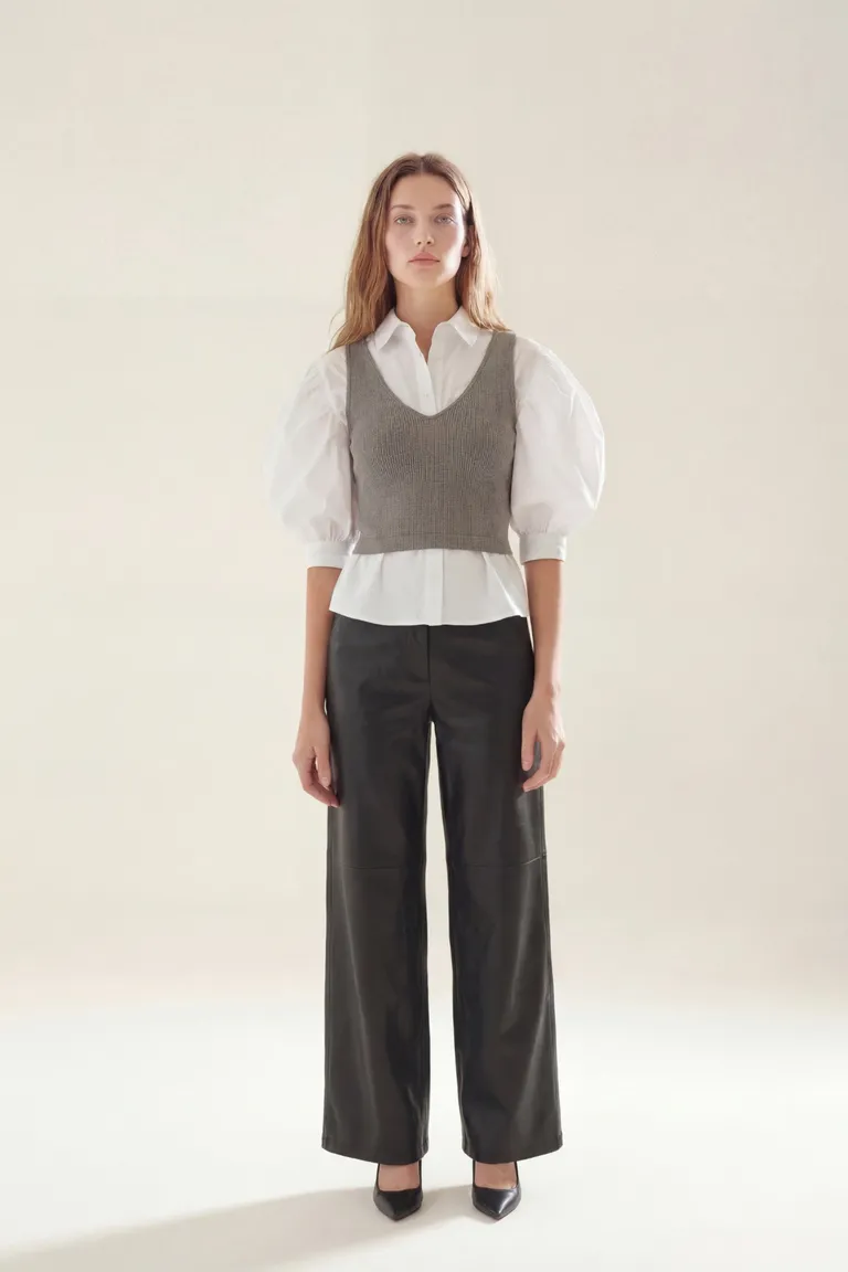 Top de punto con cuello en v y diseño ajustado, ideal para combinar con camisas o usar como prenda principal en diversos conjuntos urbanos.