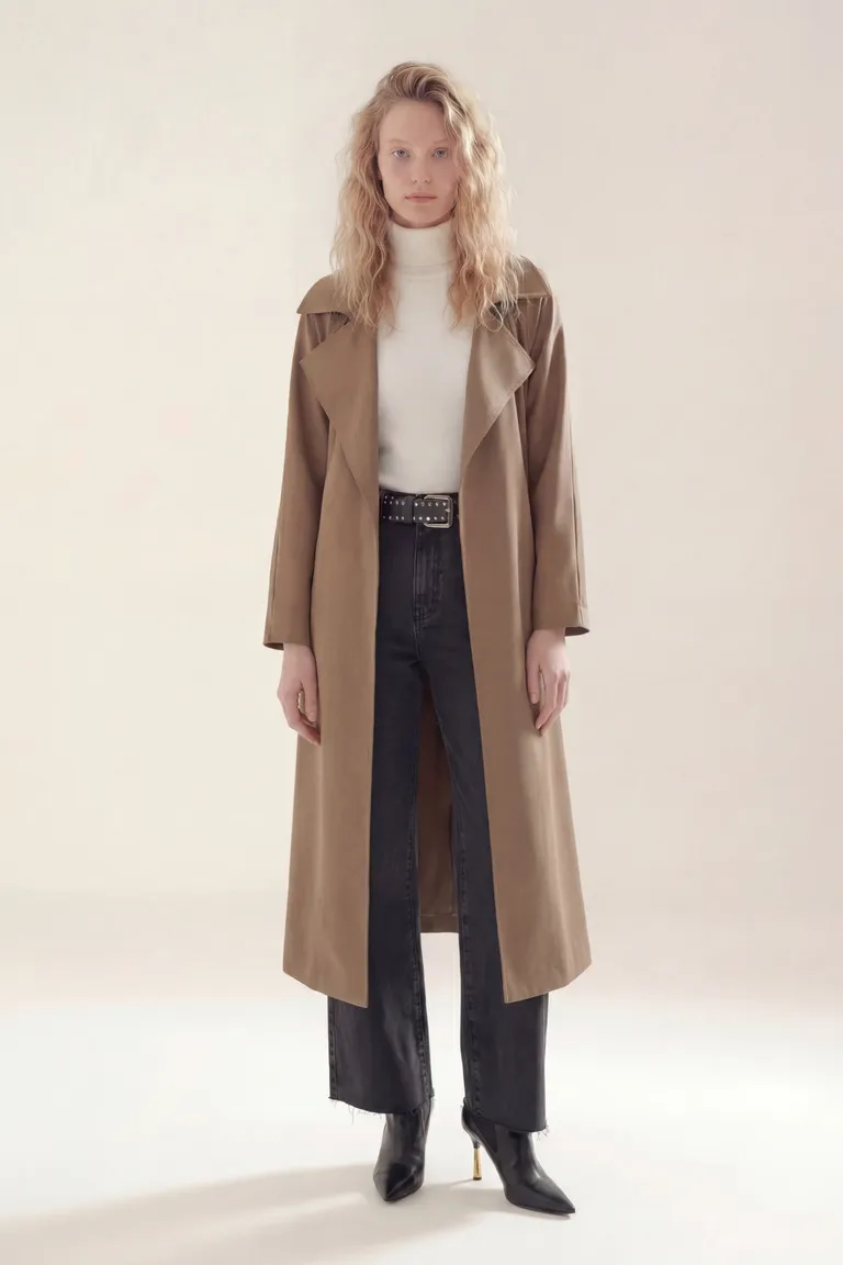 Trench de corte clásico con solapas amplias y diseño de largo midi, ideal para completar equipos de media estación con versatilidad. Presenta una silueta fluida que se adapta a diversas ocasiones, manteniendo una estética urbana y funcional.