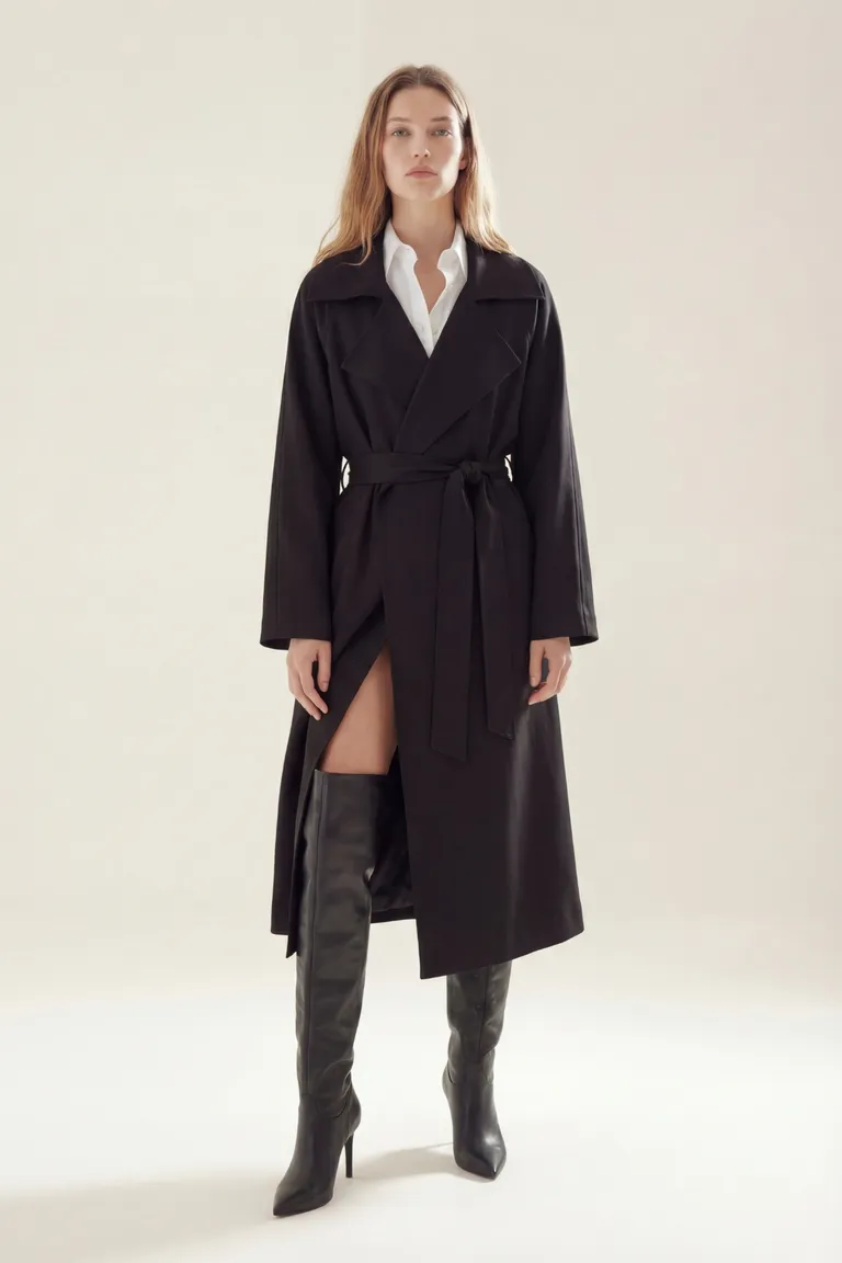Trench coat de diseño clásico con solapas amplias y lazo para ajustar en la cintura. Esta prenda de abrigo presenta una caída fluida y un estilo atemporal, ideal para completar looks urbanos con elegancia y versatilidad. Con corte largo y líneas depuradas, es una opción esencial para el guardarropa de media estación.