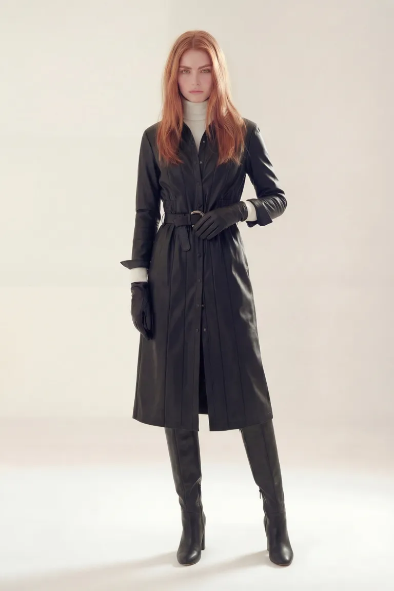 Vestido largo con cierre frontal de botones y cinturón integrado que marca la silueta. Presenta un diseño de corte recto con mangas largas, ideal para combinar en looks formales o urbanos durante temporadas de temperaturas bajas. Su estructura permite un calce definido y elegante.