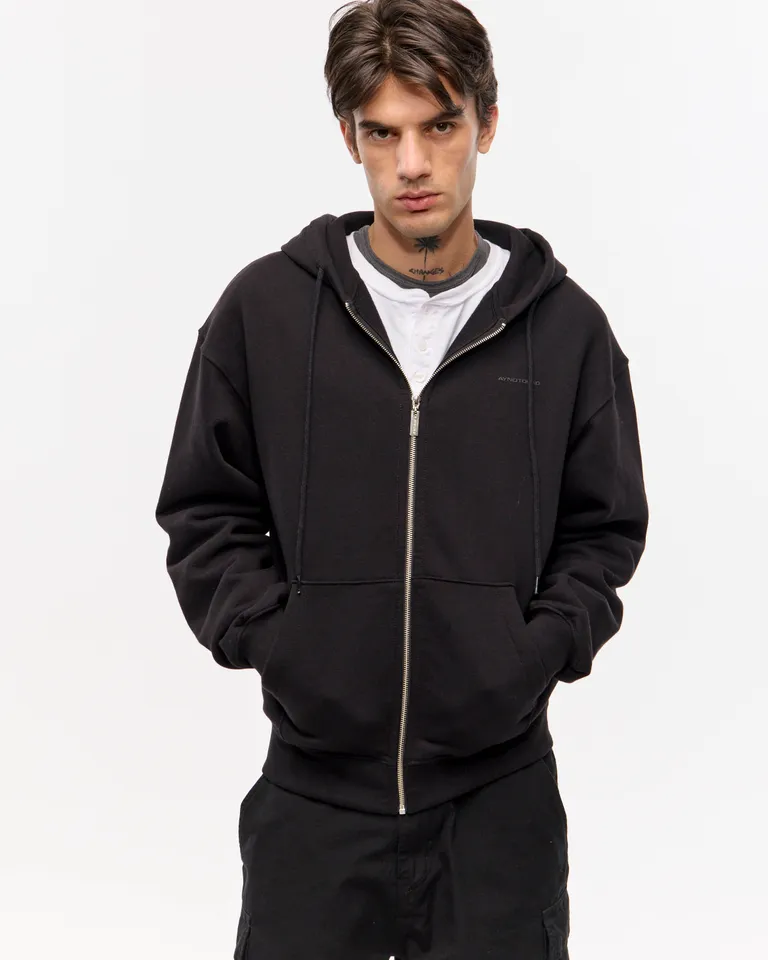 Buzo con capucha, cierre frontal metálico y bolsillos estilo canguro. Presenta un diseño de corte holgado y relajado, ideal para completar equipos urbanos con un estilo contemporáneo y versátil para el uso diario.