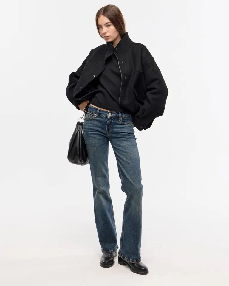 Jean de tiro bajo con corte bootcut y diseño de cinco bolsillos. Presenta una silueta ajustada en la parte superior que se ensancha suavemente hacia el ruedo. Ideal para un look urbano y relajado con un acabado que evoca estilo vintage.
