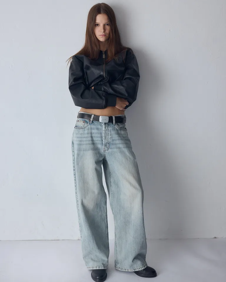 Pantalón de jean con diseño holgado y tiro bajo. Presenta un corte de pierna ancha y estilo desgastado, con cinco bolsillos funcionales y ajuste mediante cierre y botón. Ideal para lograr un look relajado y urbano en cualquier ocasión cotidiana.