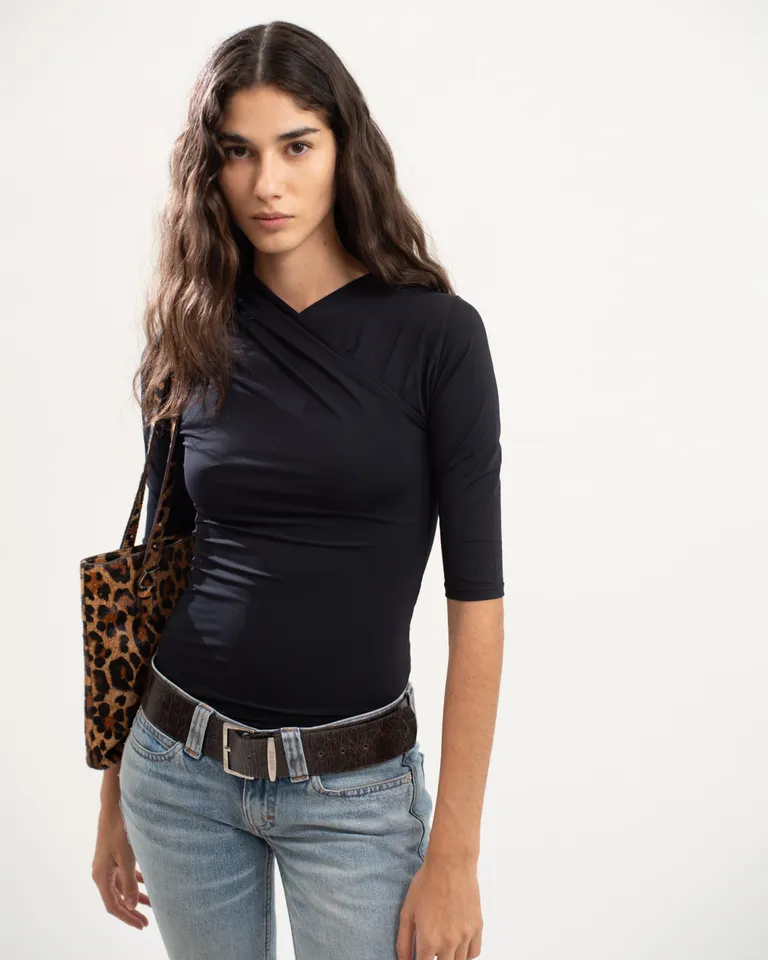 Top de ajuste entallado con diseño cruzado en el escote y mangas tres cuartos. Esta prenda básica y versátil es ideal para completar diversos outfits diarios, ofreciendo un calce cómodo y moderno que llega a la altura de la cadera. Su diseño minimalista permite múltiples combinaciones para diferentes ocasiones, destacándose por su elegancia funcional y estilo contemporáneo.