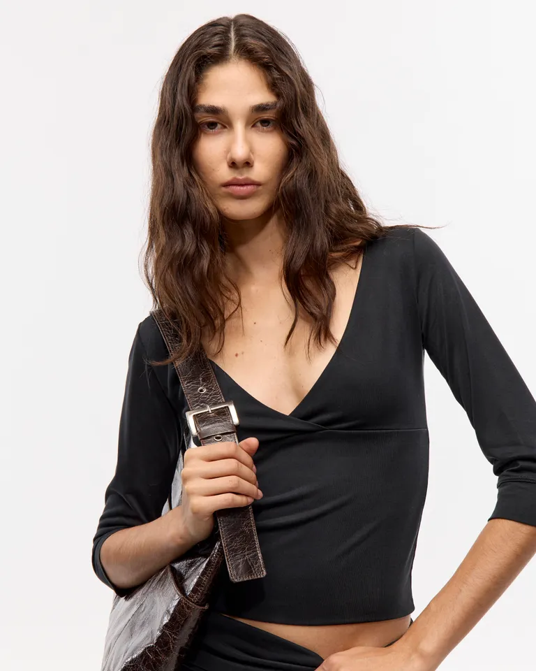 Top de mujer con mangas tres cuartos y escote cruzado. Presenta un corte ajustado al cuerpo con largo hasta la primera cadera. Ideal para completar looks casuales y urbanos en cualquier ocasión.