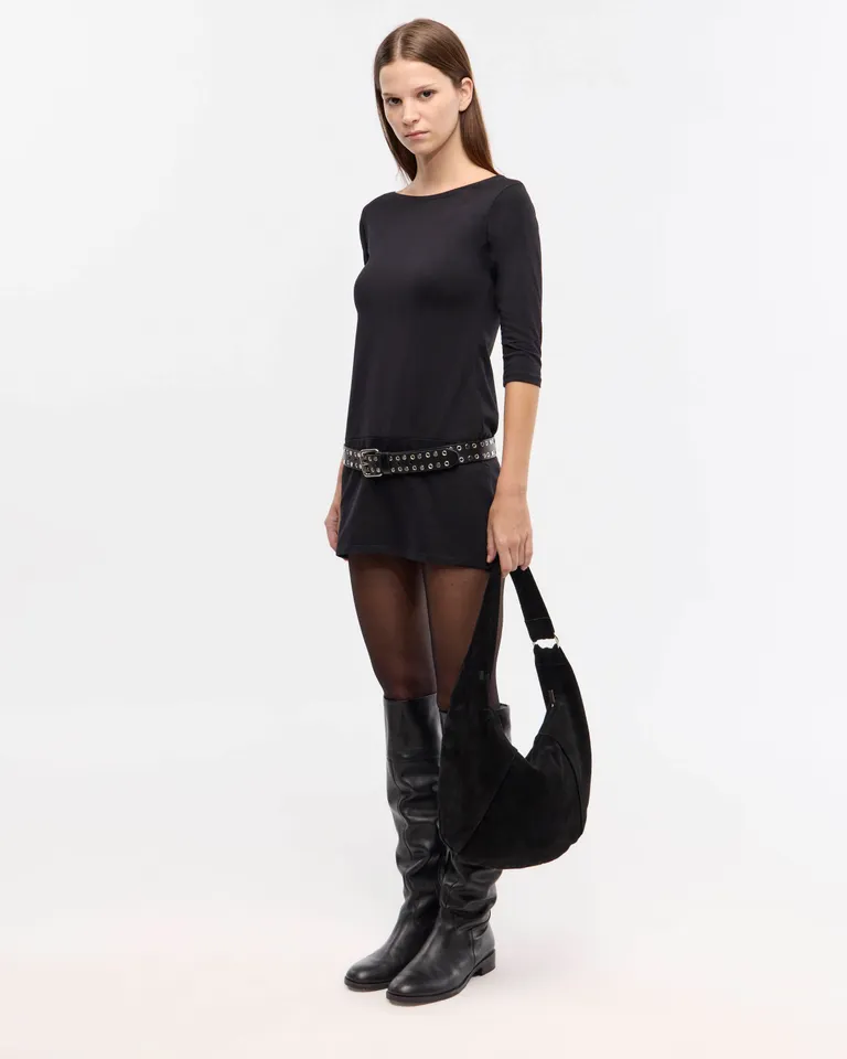Vestido corto de diseño minimalista con cuello bote y mangas tres cuartos. Presenta un ajuste cómodo y versátil, ideal para integrar en looks cotidianos o eventos formales. Su silueta fluida permite una gran libertad de movimiento, ofreciendo una opción clásica y sofisticada para el guardarropa femenino. La prenda destaca por su corte recto y su estilo atemporal que se adapta a diversas ocasiones con elegancia.