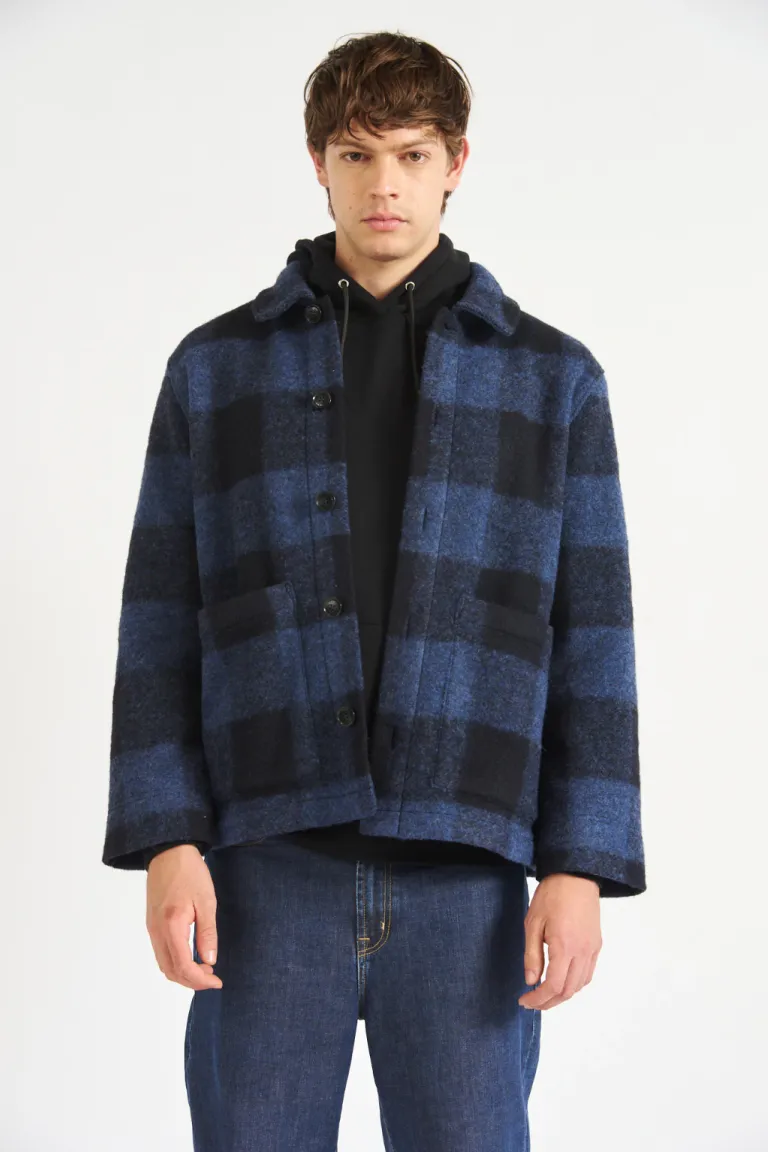 Camisaco de paño con cuello americano, diseño de botones frontales y bolsillos laterales amplios. Ideal para completar outfits urbanos con un calce relajado y cómodo, manteniendo un estilo clásico y versátil para el día a día en la temporada otoño-invierno.