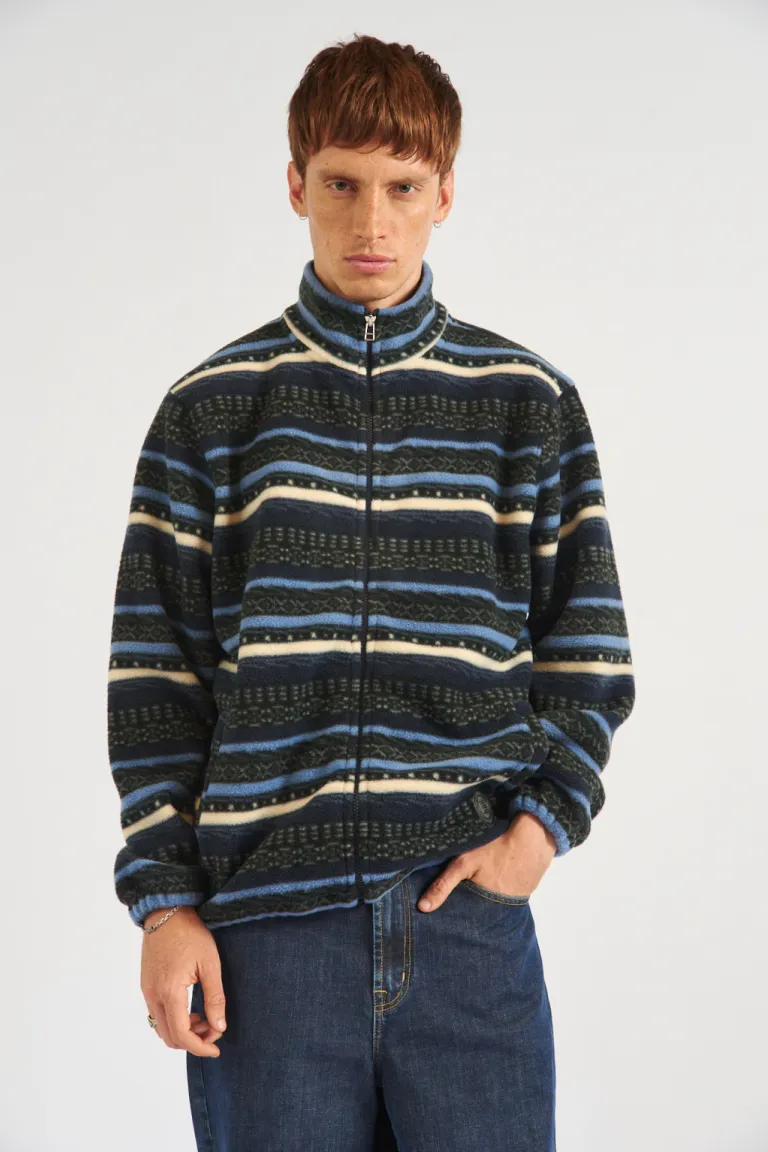 Campera con cuello alto y cierre frontal completo. Presenta un diseño de franjas horizontales con patrones decorativos, ofreciendo una opción versátil para abrigarse en días frescos. Posee bolsillos laterales funcionales, elásticos en los puños y en el ruedo para asegurar un calce cómodo y adaptable al cuerpo.