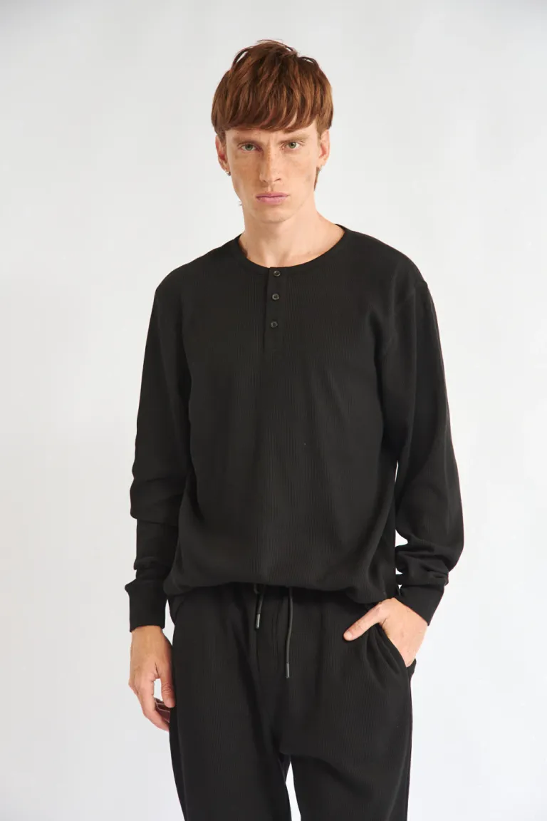 Remera de manga larga estilo henley con cuello redondo y cartera con botones. Presenta un calce regular cómodo y puños definidos. Una prenda versátil y esencial para completar conjuntos casuales de uso diario.