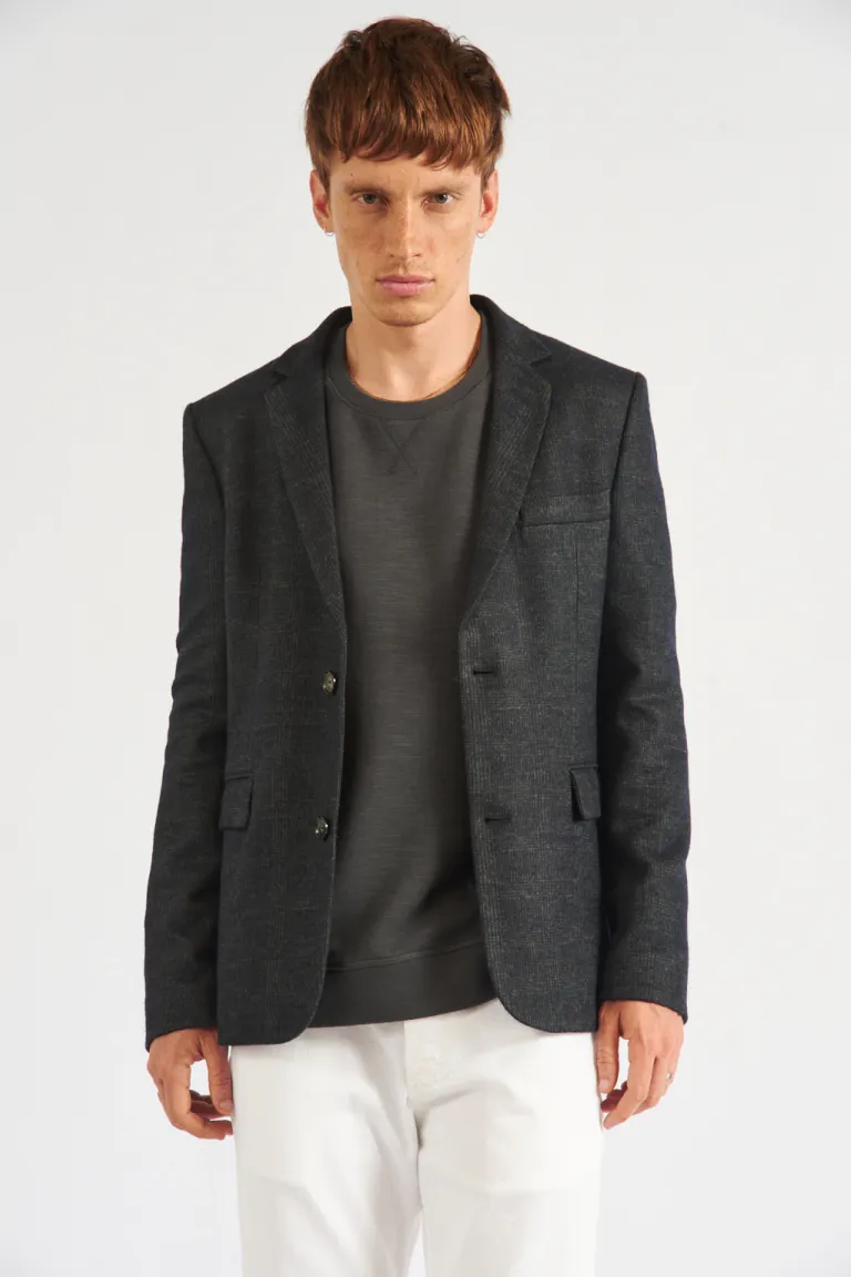 Saco de corte sastrero con diseño de estampado tipo príncipe de Gales. Presenta cierre frontal mediante dos botones, bolsillos laterales con tapa y bolsillo superior. Incluye un tajo central en la parte trasera y un interior parcialmente forrado con costuras terminadas, ofreciendo una estructura clásica y versátil para combinar en ocasiones formales o de uso cotidiano.