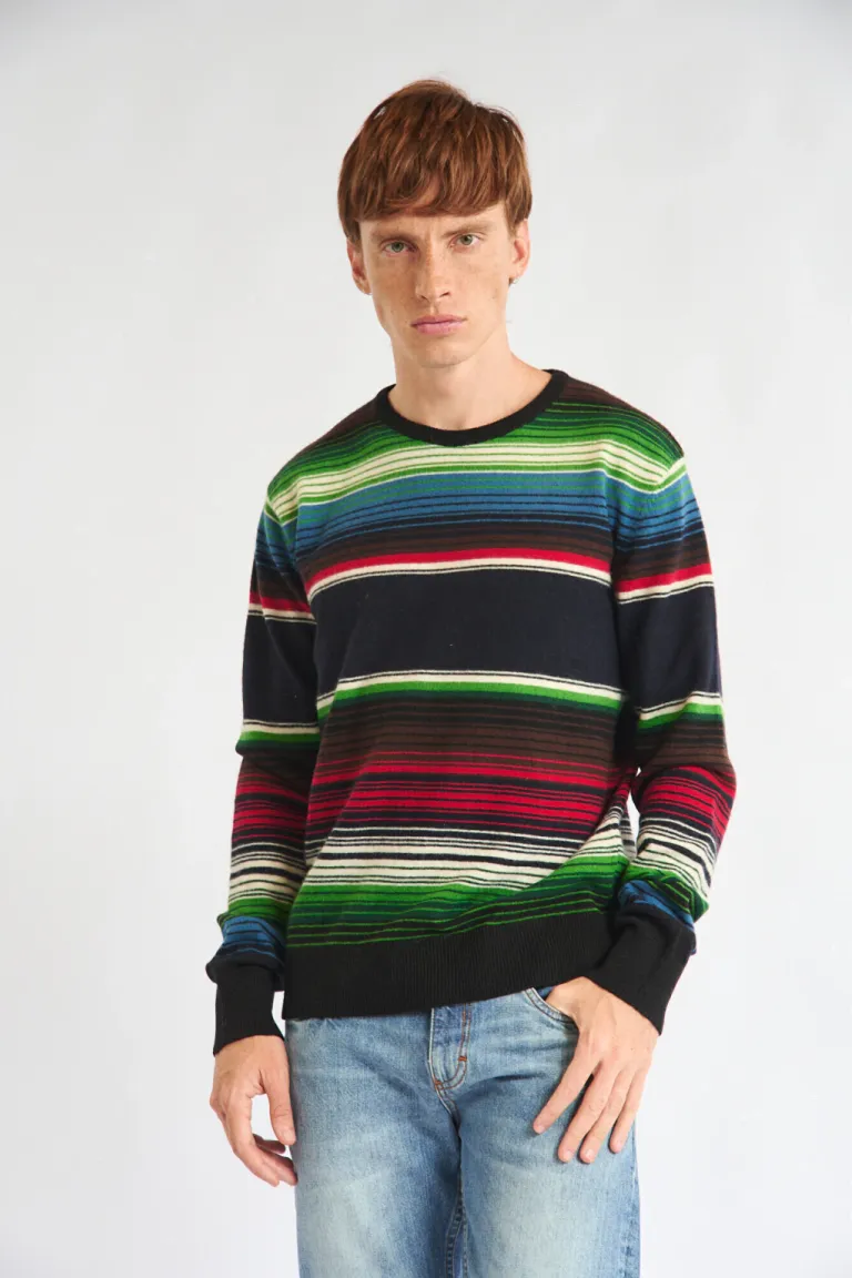Suéter de corte clásico con diseño de rayas horizontales de múltiples tonos y cuello redondo. Presenta puños y cintura con terminaciones ajustadas para un calce cómodo y versátil. Una prenda ideal para combinar en looks casuales o urbanos durante la temporada de otoño e invierno.