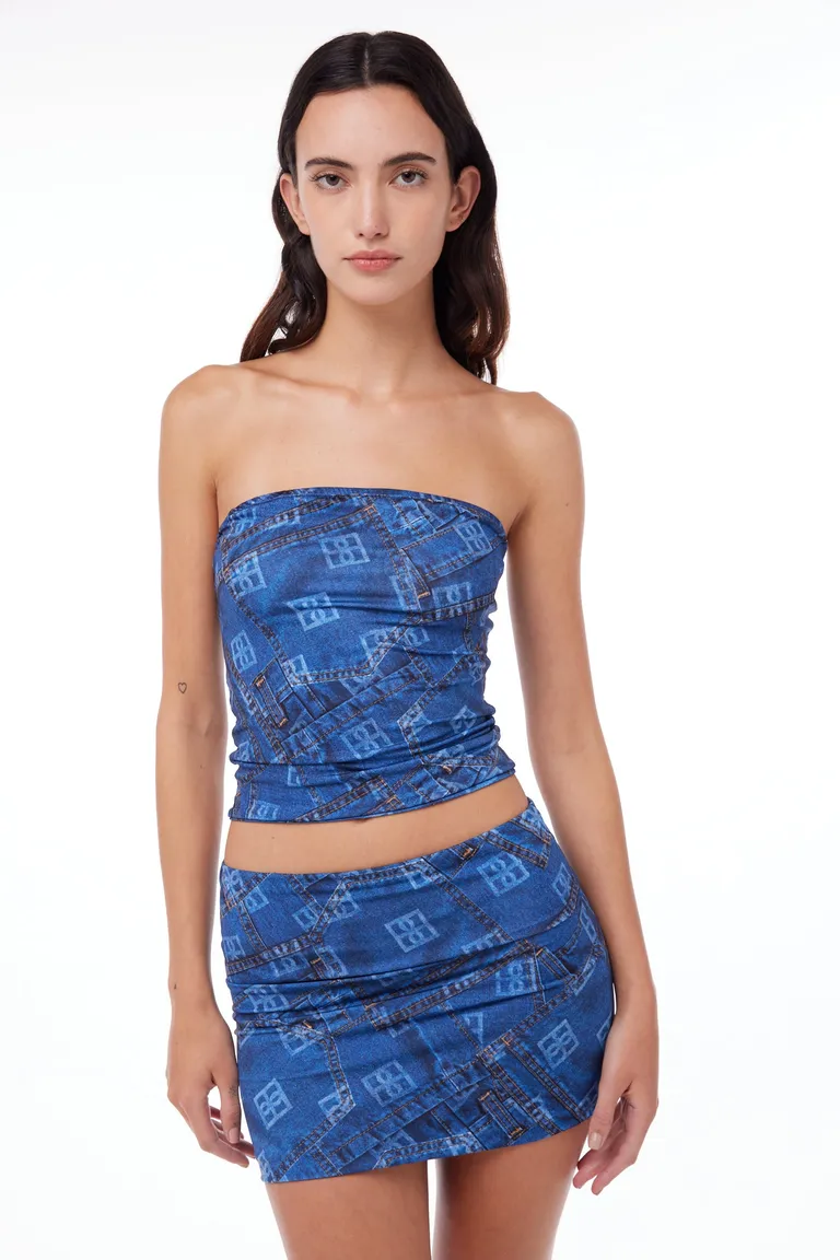 Falda corta de calce ajustado con diseño estampado, ideal para armar conjuntos urbanos y modernos. Su confección permite un ajuste cómodo que se adapta a la figura, siendo una opción práctica y versátil para diversos momentos del día.