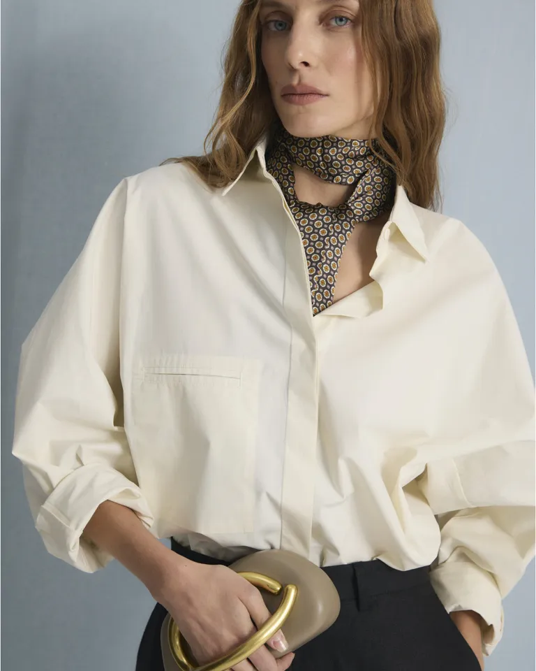 Camisa de calce oversize con líneas amplias y mangas con volumen. Presenta cartera oculta, bolsillo delantero con ribetes y espalda con tabla diagonal asimétrica. Una prenda de diseño versátil con líneas modernas y estructuradas, ideal para un look contemporáneo.