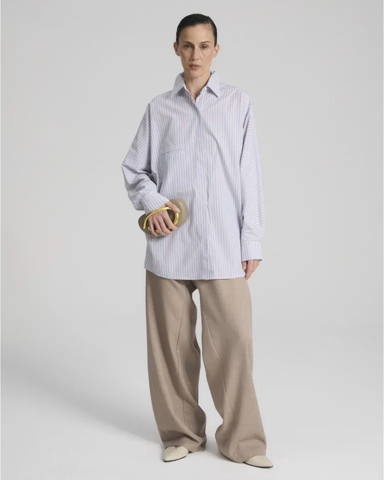Camisa oversize de líneas amplias con mangas voluminosas. Presenta cartera oculta, bolsillo delantero y un diseño de espalda con tabla diagonal asimétrica que aporta carácter. Ideal para un look sofisticado y moderno, esta prenda destaca por su corte holgado y detalles estructurales únicos.