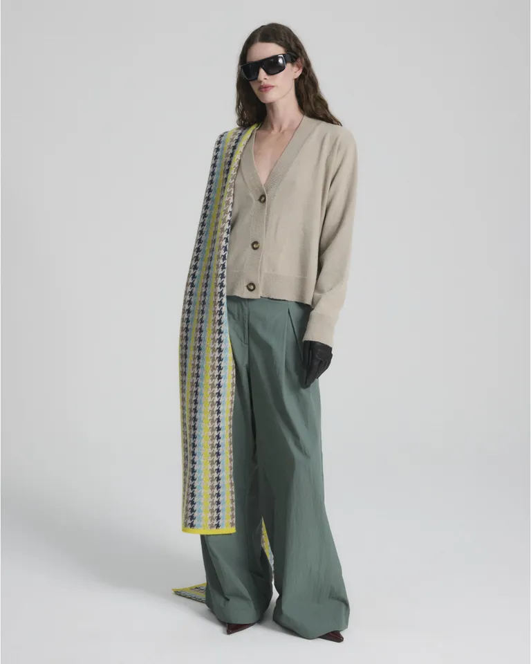 Cardigan con escote en V y cierre frontal abotonado. Diseño de corte clásico con mangas largas, ideal para combinar en looks casuales y versátiles de media estación. Presenta un estilo minimalista que se adapta a diversas ocasiones.