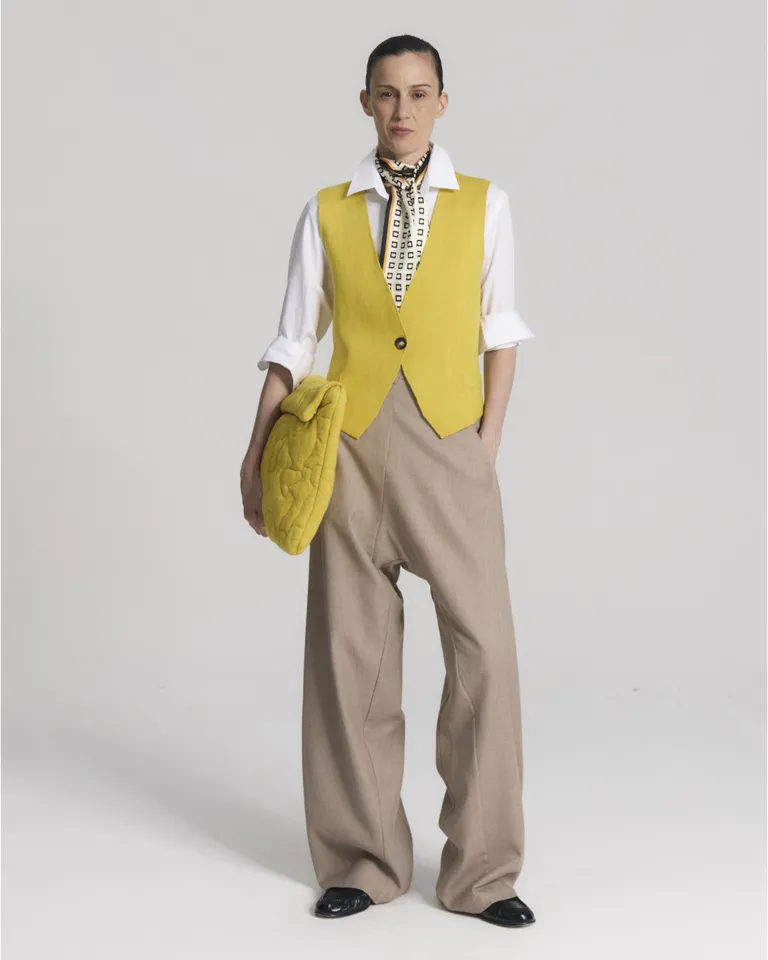 Chaleco sastrero con cuello en V y cierre frontal con un botón. Diseño de líneas simples y calce relajado con lazos ajustables en la parte posterior para definir la silueta. Ideal para combinar en outfits formales o informales de estilo moderno.