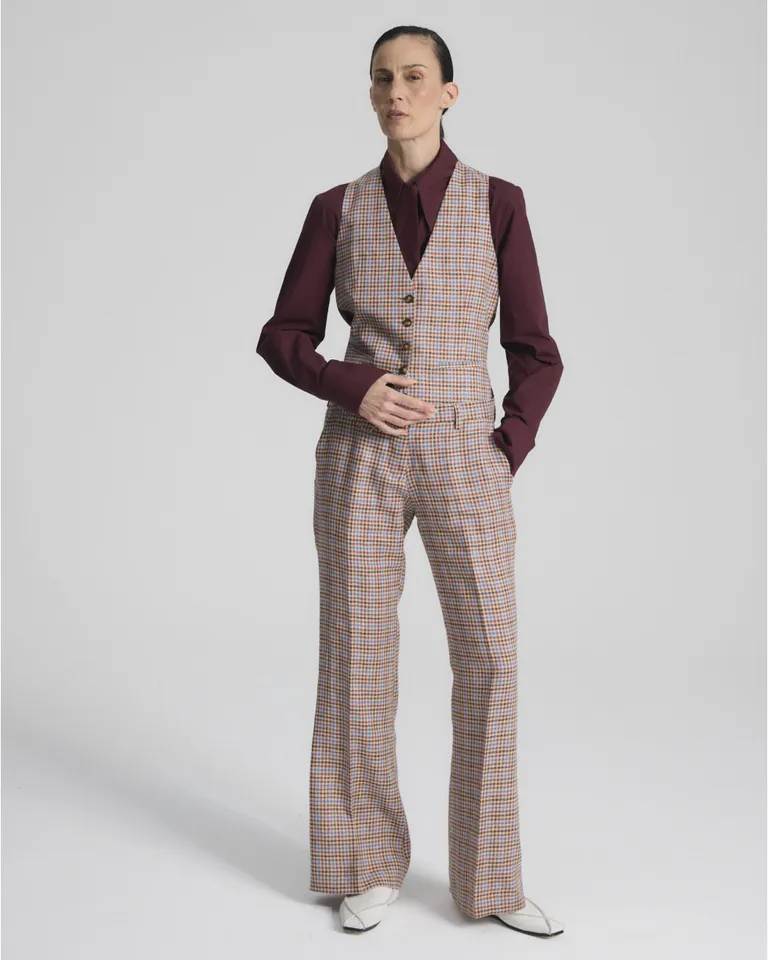 Chaleco sastrero con diseño de cuadros, escote en V y cierre frontal con botones. Incluye ajuste posterior para una silueta entallada y versátil, ideal para combinar en conjuntos formales o informales. Un básico atemporal con caída estructurada, diseñado para un calce preciso y sofisticado en cualquier ocasión.