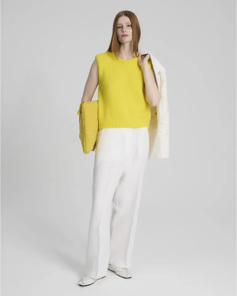Chaleco sin mangas de calce regular con escote redondo a la base. Presenta un diseño clásico con terminaciones de puño doble en sisas y cintura, ideal para usar como capa adicional en diversos equipos diarios. Una prenda versátil, cómoda y funcional que aporta textura y abrigo al vestuario casual.