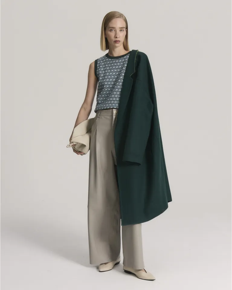 Chaleco sin mangas de diseño tejido con textura visual y escote redondo a la base. Esta prenda presenta terminaciones en tono liso en las sisas y el cuerpo, ofreciendo una opción versátil para combinar en diversos outfits. Ideal para usar solo o sobre otras prendas, aportando una capa extra de estilo a tus conjuntos diarios.