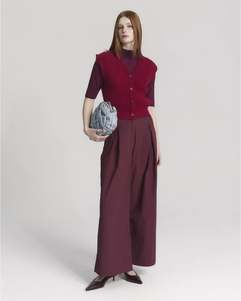 Chaleco de tejido con cuello en v y cierre frontal mediante botones. Esta prenda presenta un diseño con detalle de frunces en los hombros que realzan su estructura, junto con una terminación acanalada en la cintura para un ajuste preciso al cuerpo. Ideal para crear superposiciones en looks urbanos, ofreciendo un estilo versátil y contemporáneo para diversas ocasiones.