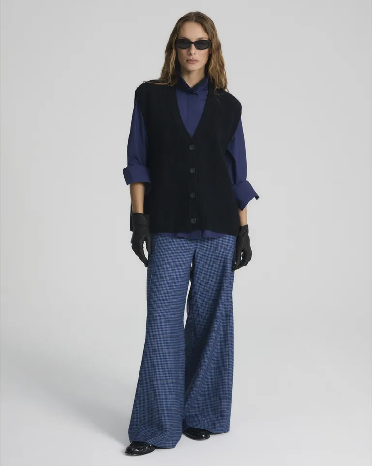 Chaleco con escote en V y diseño de tejido tramado con cierre frontal. Su silueta relajada permite una caída natural, mientras que los lazos tejidos en la parte posterior brindan la posibilidad de ajustar el calce según la preferencia de uso. Una prenda versátil ideal para combinar en diversas capas durante el día.