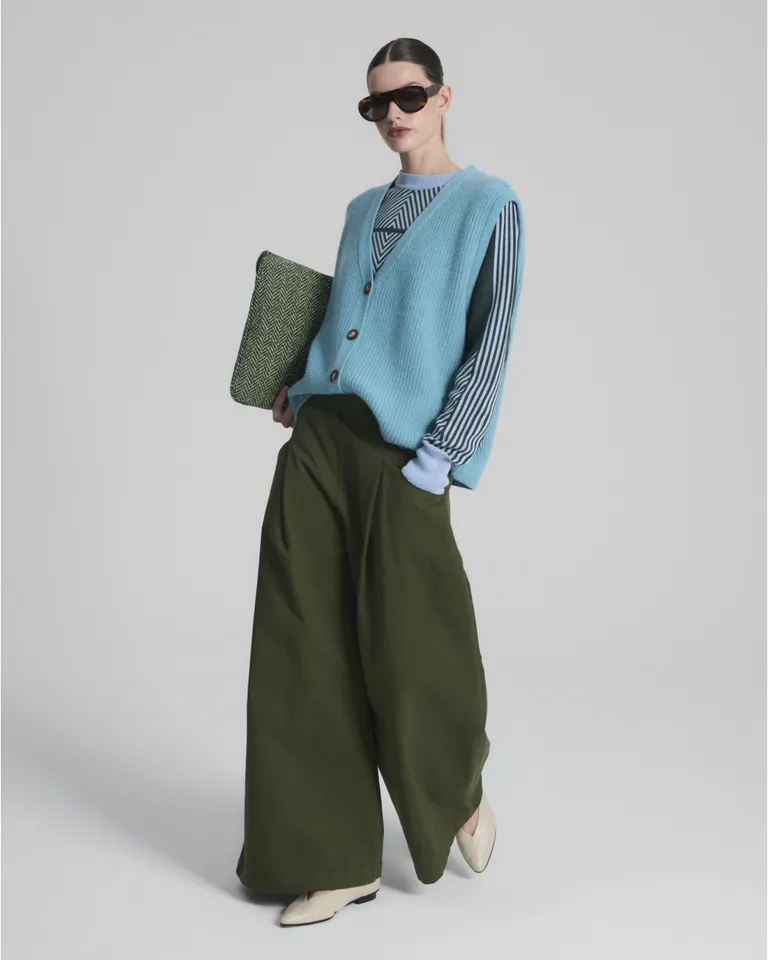 Chaleco con escote en V y diseño de tejido tramado con cierre frontal. Su silueta relajada permite una caída natural, mientras que los lazos tejidos en la parte posterior brindan la posibilidad de ajustar el calce según la preferencia de uso. Una prenda versátil ideal para combinar en diversas capas durante el día.