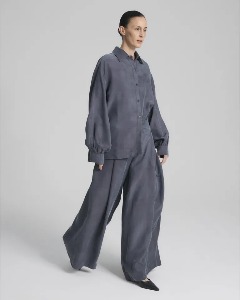 Pantalón de mujer de tiro alto con pierna ancha, tablas delanteras y cierre invisible lateral de Blue Sheep en Pantalones para argentina