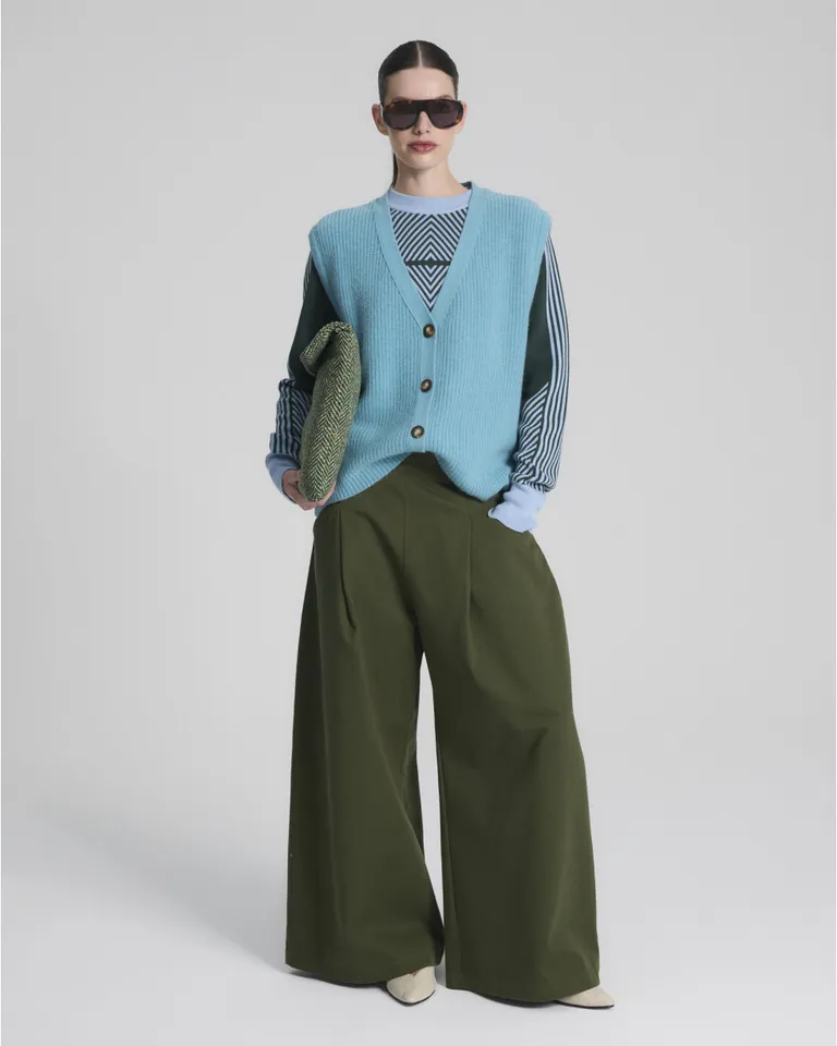 Pantalón de corte sastrero con diseño de pierna ancha y tiro alto. Presenta pinzas en la parte frontal que otorgan una caída fluida y estructura a la prenda. Ideal para outfits formales o de uso diario, este modelo combina comodidad y estilo contemporáneo. Su diseño minimalista y versátil permite diversas combinaciones, ofreciendo una silueta estilizada y moderna para el guardarropa femenino.