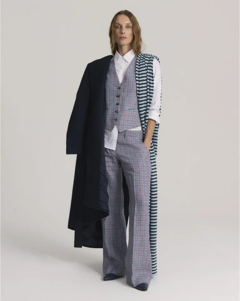 Pantalón sastrero de tiro bajo con diseño de cuadros y calce ajustado que se ensancha hacia la base. Presenta cintura plana con cierre, gancho y botón interno, complementado con bolsillos laterales y traseros tipo ojal. Una prenda versátil para un look sofisticado.