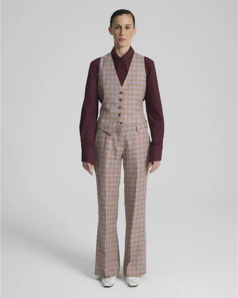Pantalón sastrero de tiro bajo con diseño de cuadros y calce ajustado que se ensancha hacia la base. Presenta cintura plana con cierre, gancho y botón interno, complementado con bolsillos laterales y traseros tipo ojal. Una prenda versátil para un look sofisticado.