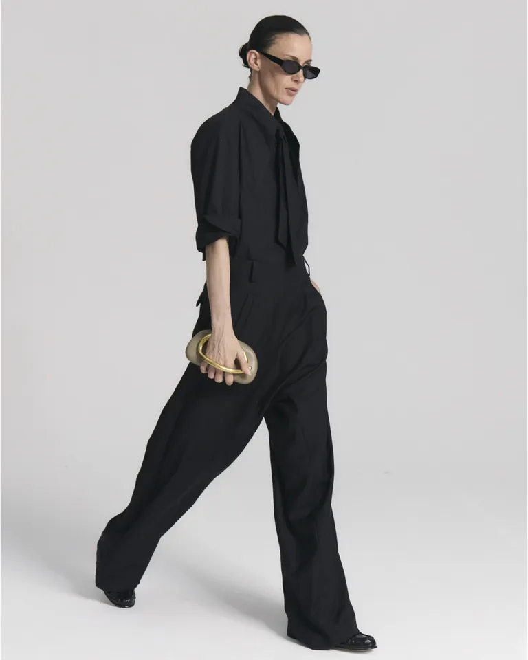 Pantalón de estilo sastrero con tiro largo y diseño de pliegue cruzado en la cintura. Presenta una caída fluida, bolsillos laterales, bolsillo con tapa en el posterior y cierre invisible lateral que aporta un acabado prolijo. Ideal para lograr un look sofisticado y moderno en cualquier ocasión.