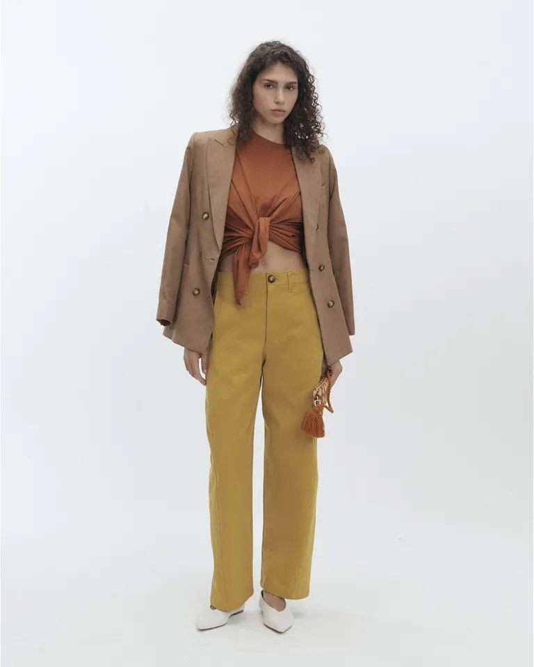 Remera de manga corta con escote redondo y detalle de nudo frontal. Esta prenda presenta una terminación con puño de ribb y un diseño versátil para incorporar en conjuntos diarios con un toque moderno y urbano.