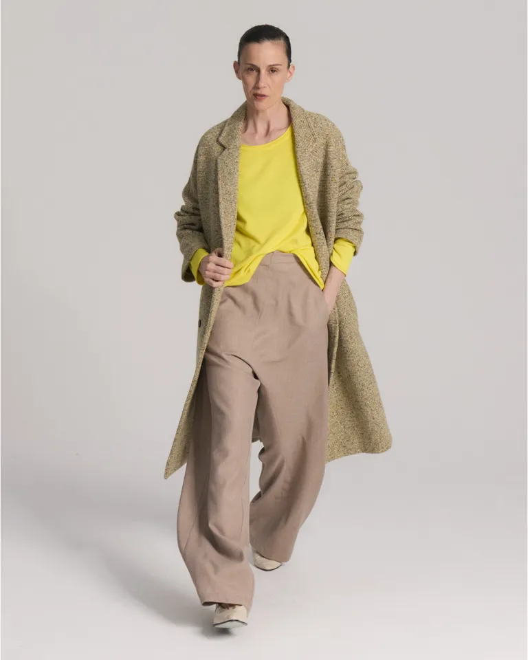 Remera de corte relajado con escote bote y diseño de hombros caídos. Esta prenda básica presenta pequeños tajos laterales en el ruedo que brindan mayor movimiento y comodidad. Su estilo versátil la convierte en una opción excelente para integrar en múltiples combinaciones diarias, funcionando perfectamente tanto como primera piel como pieza protagonista de un conjunto urbano y moderno.