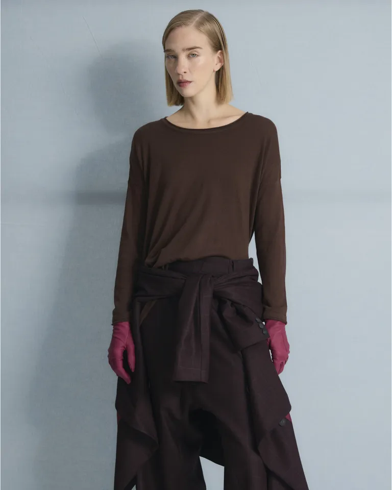 Remera de calce relajado con escote bote y hombros caídos. Presenta un diseño minimalista con tajos laterales en el ruedo, ideal para usar como prenda base en capas o como pieza principal en looks casuales y urbanos. Una opción versátil y cómoda para incorporar en tus outfits diarios.