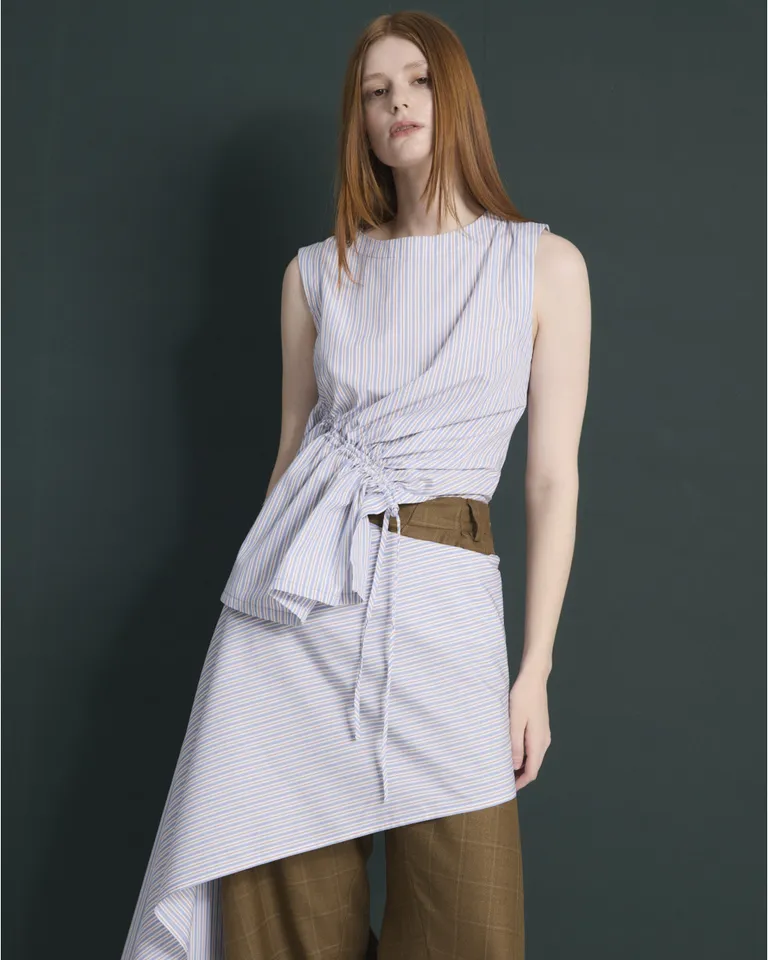 Top sin mangas con diseño a rayas. Presenta un escote a la base y una jareta frontal con cordones ajustables que crean un frunce lateral, brindando una silueta asimétrica y moderna. La espalda incluye un detalle de recorte con tajo sutil. Ideal para combinar en outfits casuales o formales, este diseño destaca por su caída única y su estilo versátil para diversas ocasiones.