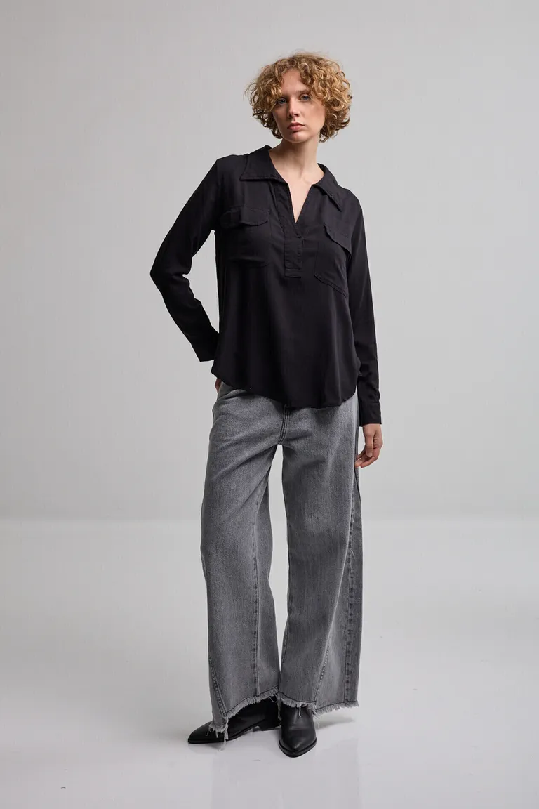 Esta elegante blusa de corte recto y escote en V es perfecta para agregar un toque de sofisticación a cualquier atuendo. Con sus prácticos bolsillos y puños con cartera, esta prenda es ideal para diversas ocasiones, desde el trabajo hasta una salida casual.