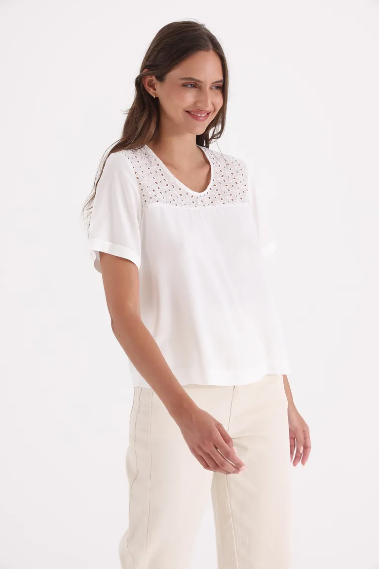 Esta elegante blusa de algodón puro se destaca por su exquisito diseño con detalles de plumeti y bordados premium. Una prenda versátil y sofisticada que eleva cualquier look, perfecta para un estilo fresco y refinado durante todo el día.