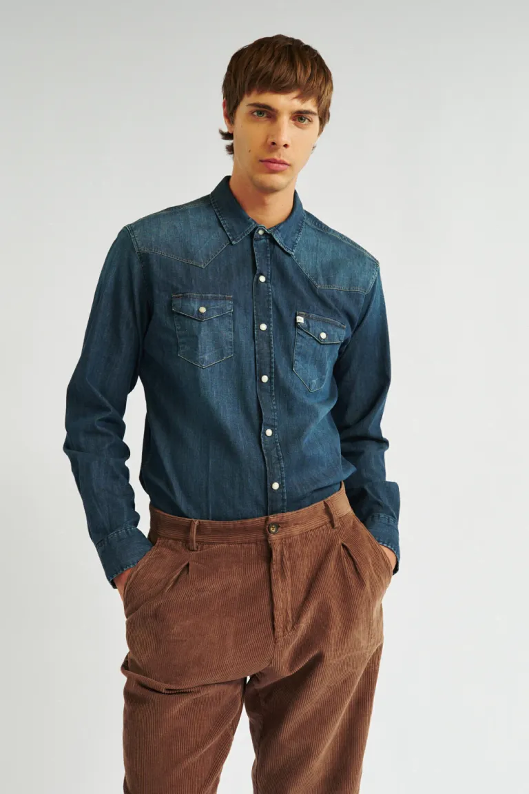 Esta camisa de denim de corte tipo vaquero es perfecta para looks casuales y elegantes. Cuenta con mangas largas, bolsillos delanteros y un diseño lavado que le da un aspecto desgastado y moderno. Ideal para complementar tu outfit diario o para ocasiones más formales.