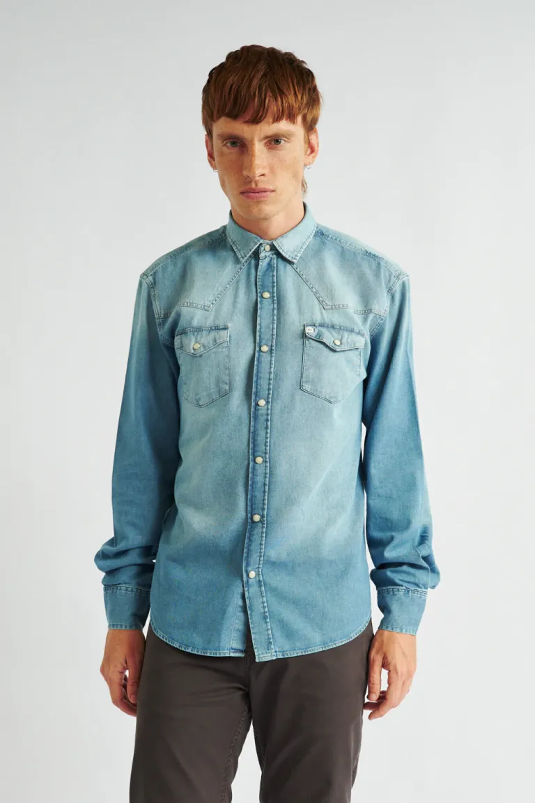 Camisa de jeans de manga larga con bolsillos y broches. Diseño clásico y versátil para un look casual y moderno. Perfecta para cualquier ocasión.
