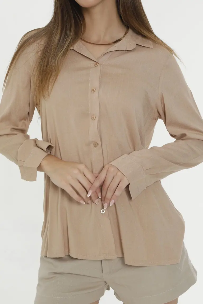 Elegante camisa femenina confeccionada en tela de lino slub, de corte clásico y estilo versátil para todo tipo de ocasiones. Perfecta para combinar con pantalones, faldas o shorts. Disponible en tallas S, M y L.