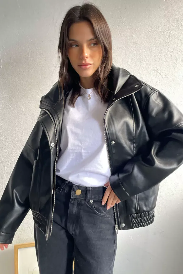 Descubrí nuestra nueva campera de eco cuero en corte oversize, perfecta para lucir un look urbano y chic. Con bolsillos en la delantera, es una prenda versátil y de gran calidad que se adapta a cualquier estilo. Consigue un aspecto moderno y elegante con esta imprescindible campera de temporada.