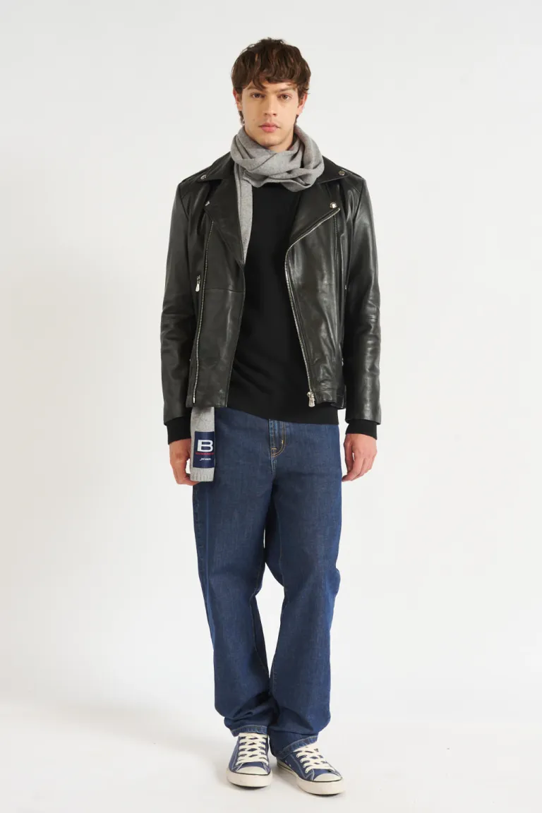 Campera de cuero de oveja negra con cierre y bolsillos laterales para hombre de Bensimon