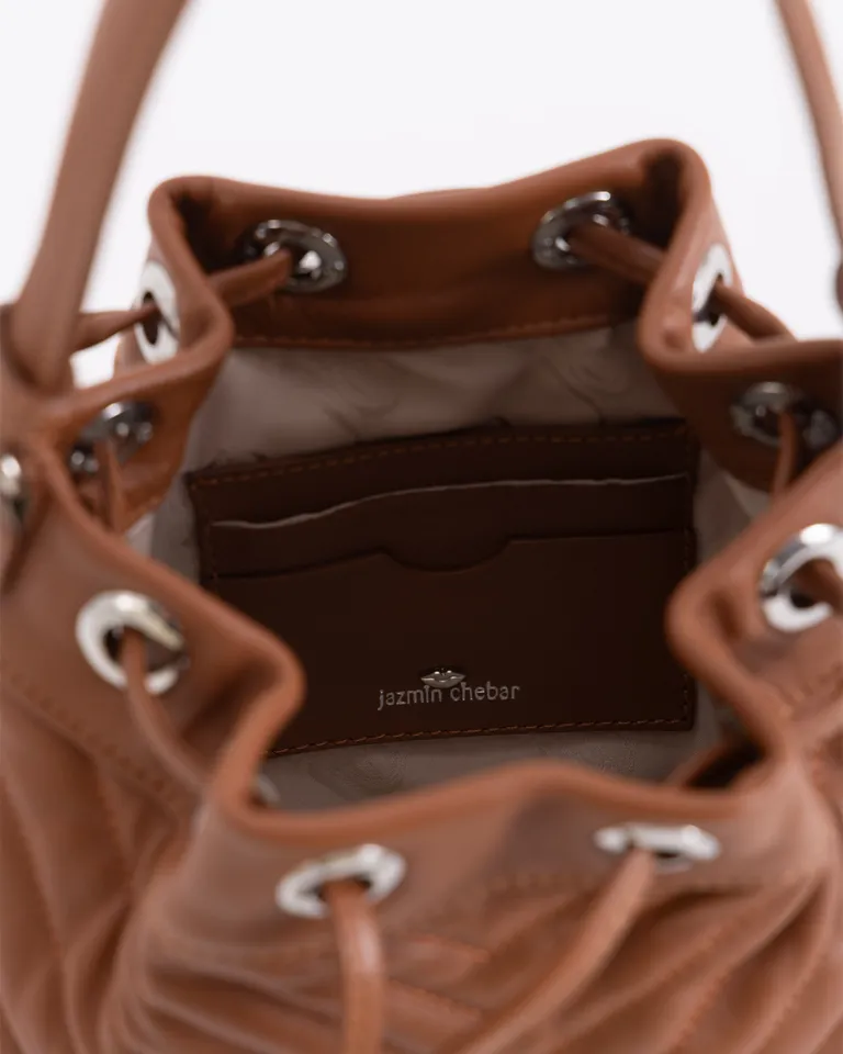 Bolso de mano de cuero marrón con detalles matelaseados y correas ajustables de Jazmin Chebar