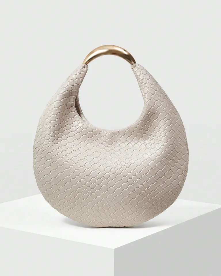 Elegante bolso de mano en forma de media luna, perfecto para complementar tus looks de día o noche. Su textura lisa y moderna le da un toque sofisticado. Ideal para llevar tus esenciales con estilo durante San Valentín o cualquier ocasión especial.